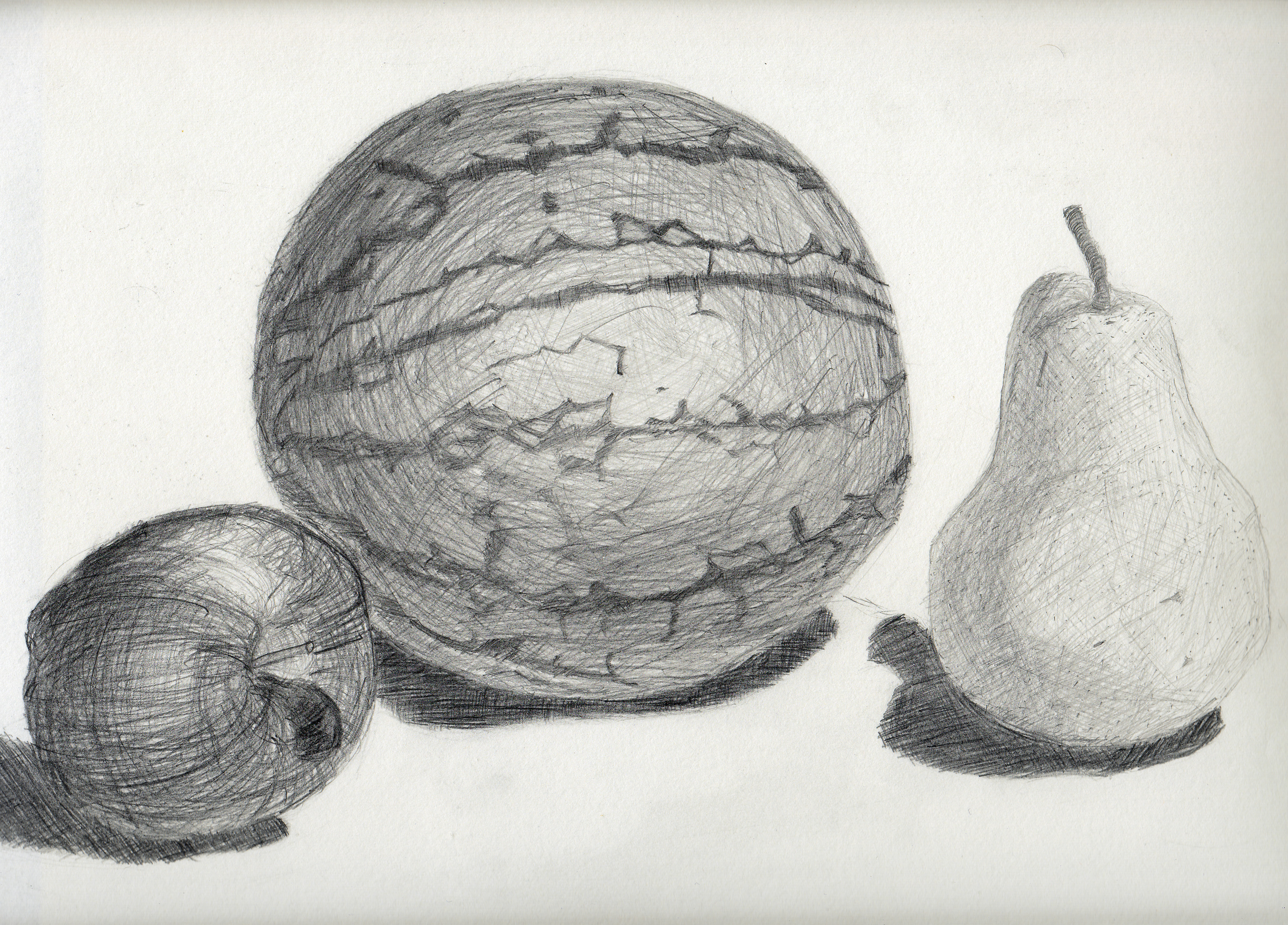 The shadow on the underside of the watermelon and the apple is too light. The lines on the watermelon were done using a 4B pencil, and the shadow underneath with a 5B. I would have liked to make the underside darker, but was afraid of losing definition.