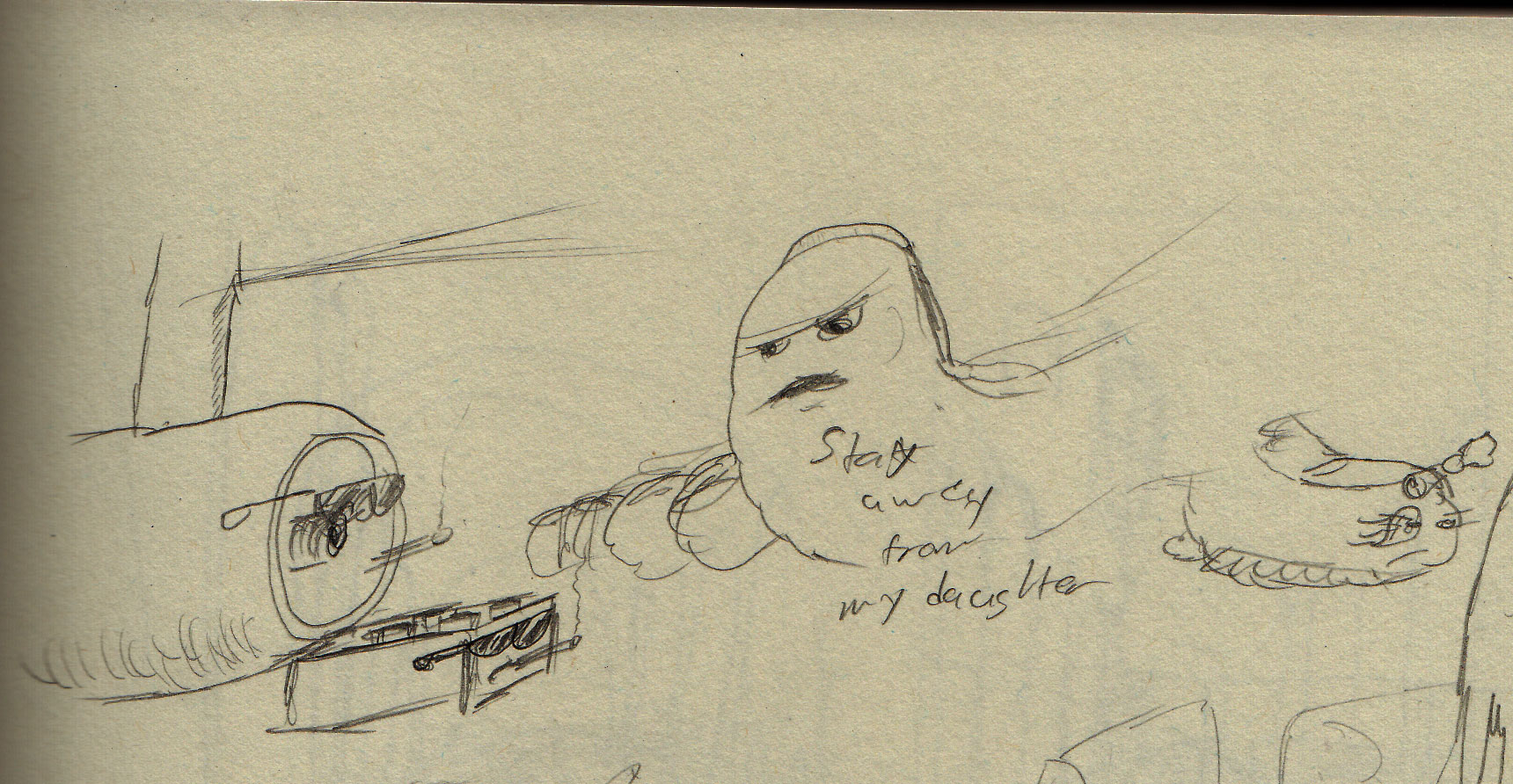 There is a (admittedly poorly drawn) daughter like toe abstractly behind dad looking sad and dejected. She’s been unjustly cut off from her love, unable to see a way out of her lachrymose abyss. She isn’t physically near dad or the bad boys, but she is on the other side of them, which is more important.