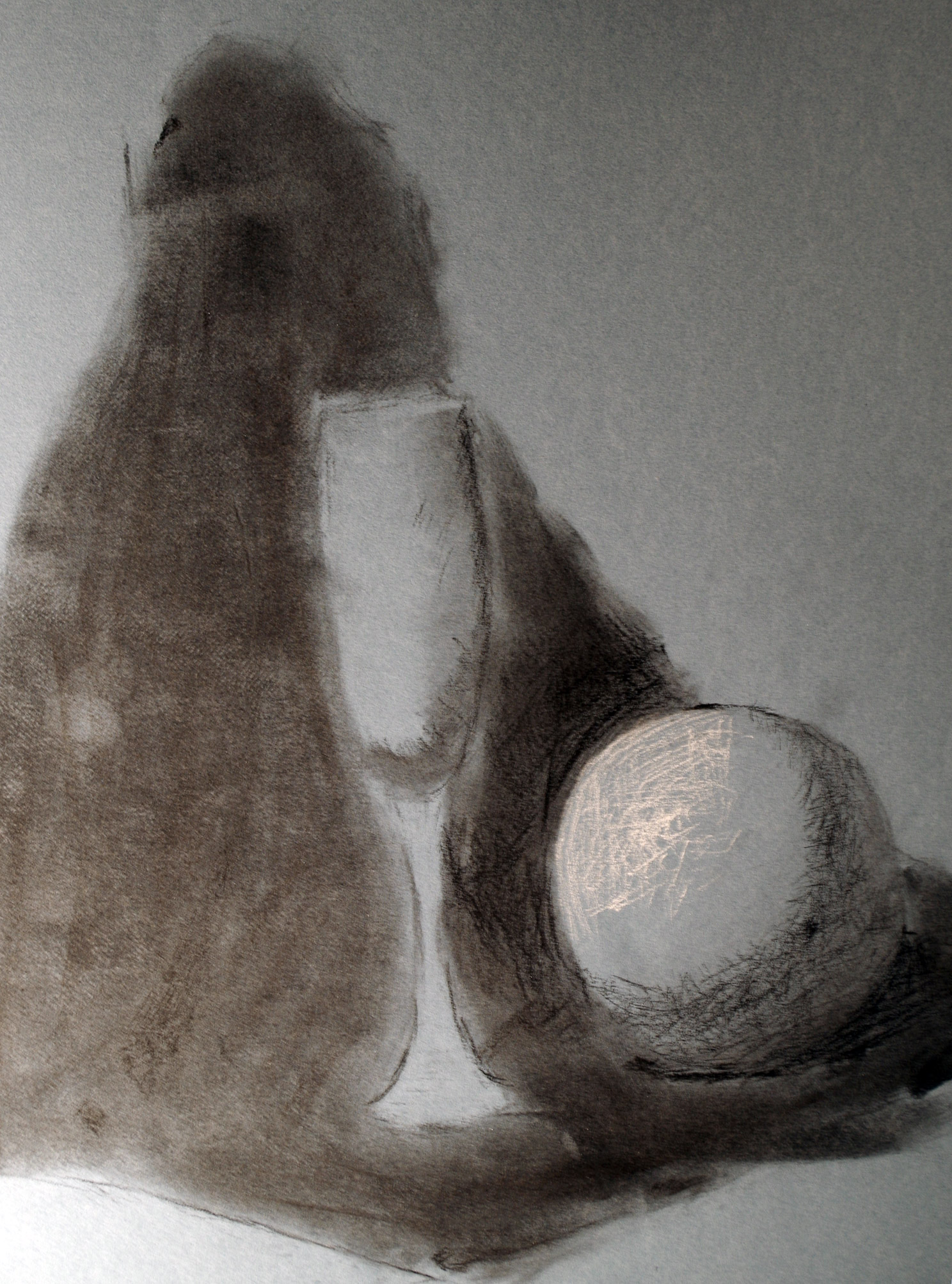 Here is a short in class assignment we did on blue toned paper. Nothing special, just a wine glass and a white ball. This was practice for the final trying to get the shading right. At the time, my heart wasn’t into it so I didn’t try as hard as I could have.