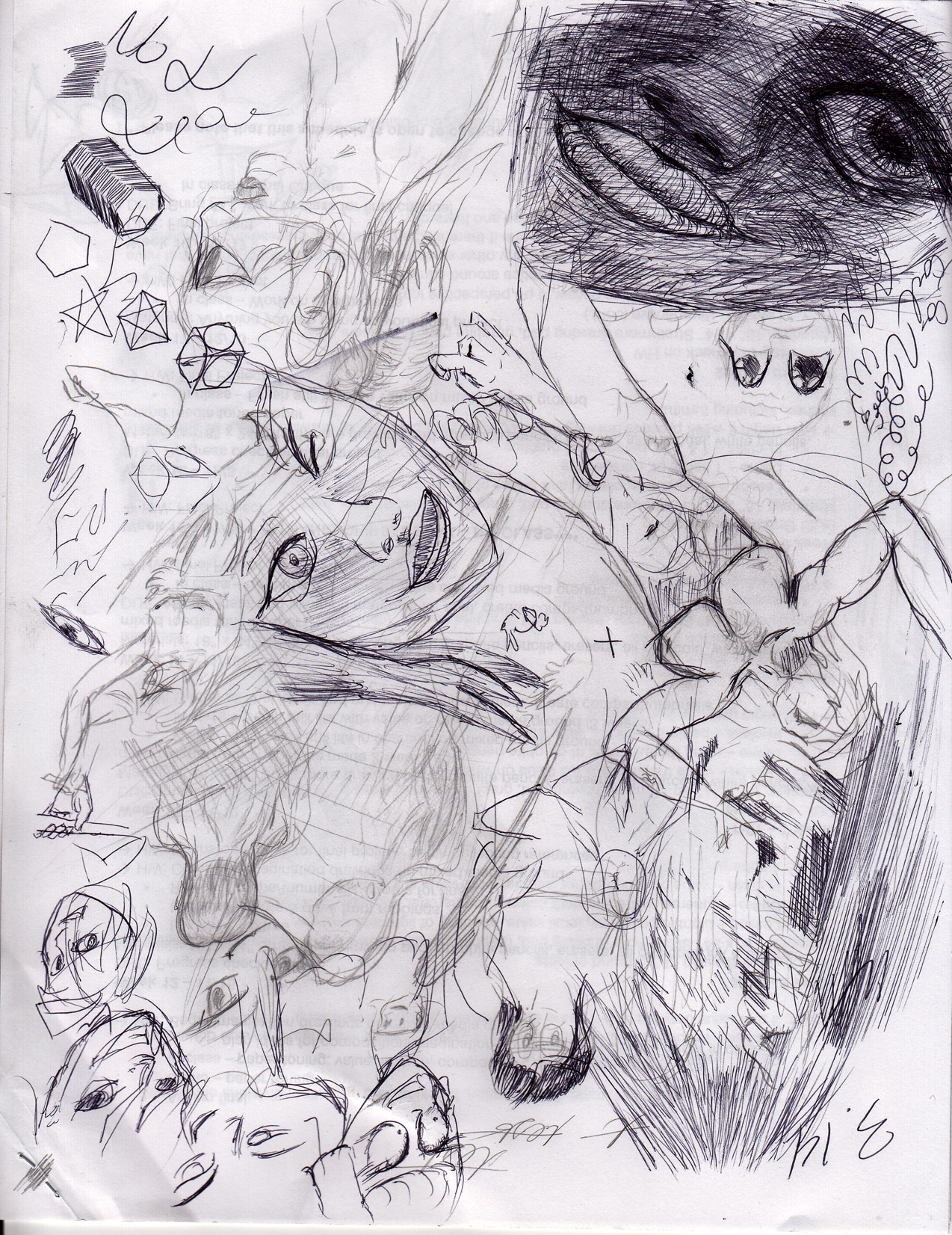 I have recently been trying my hand at human form. Faces, hands, and the rest of the body are so capable of expression that the slightest misplaced line or shadow changes the the mood entirely. For example, the face in the top right corner started off as a single eye that I grew a face around. I tried to keep eyelids, eye liner, iris, pupil, and reflection of the eye in the sketch, as well as the shadow of the eye socket. This worked out so some extent, but is foiled by the overly scrunched nose and poorly placed lips. To be honest, I really have no idea how to place these elements. Trying to construct a face usually result in an angry looking person (neither male nor female, despite my attempts).