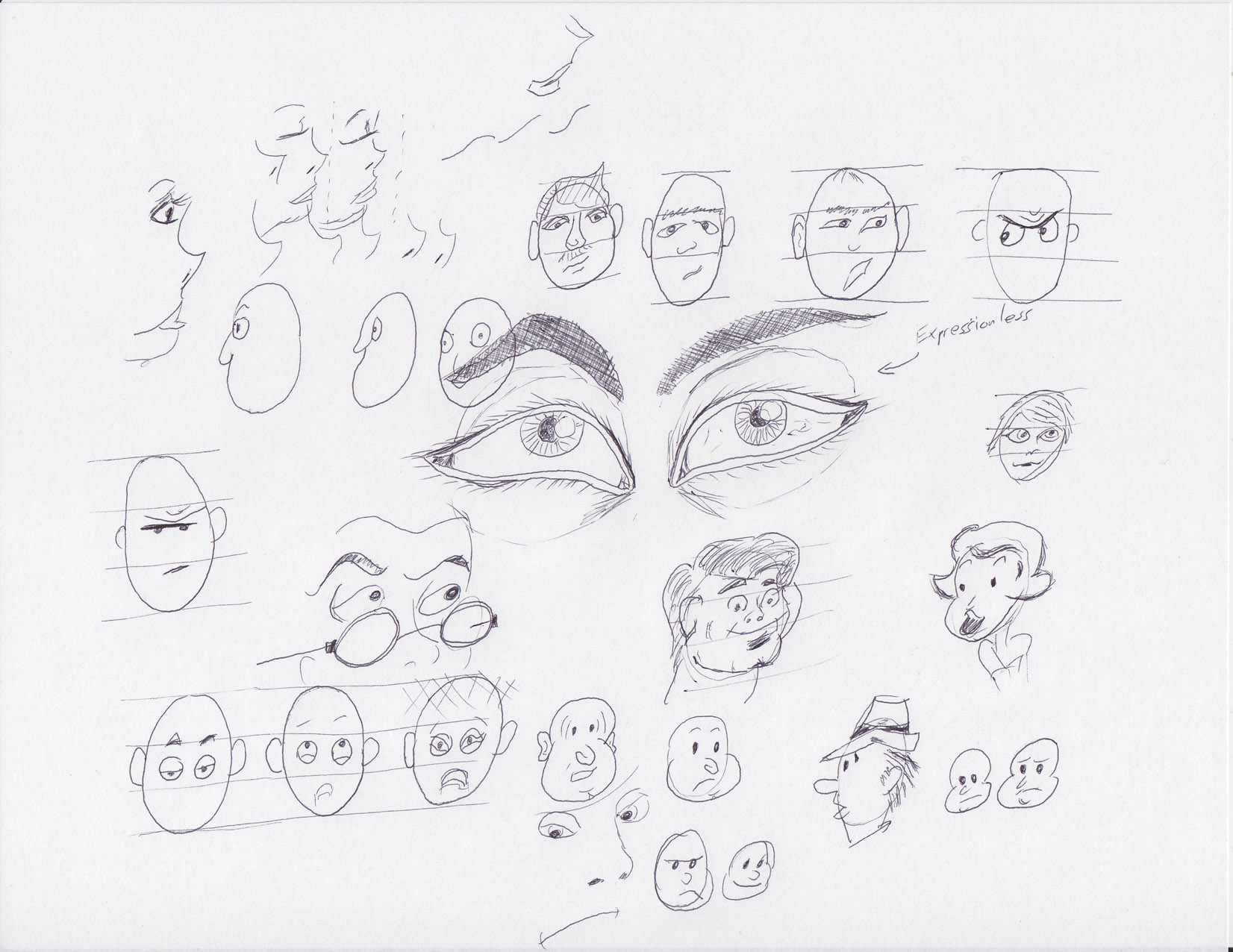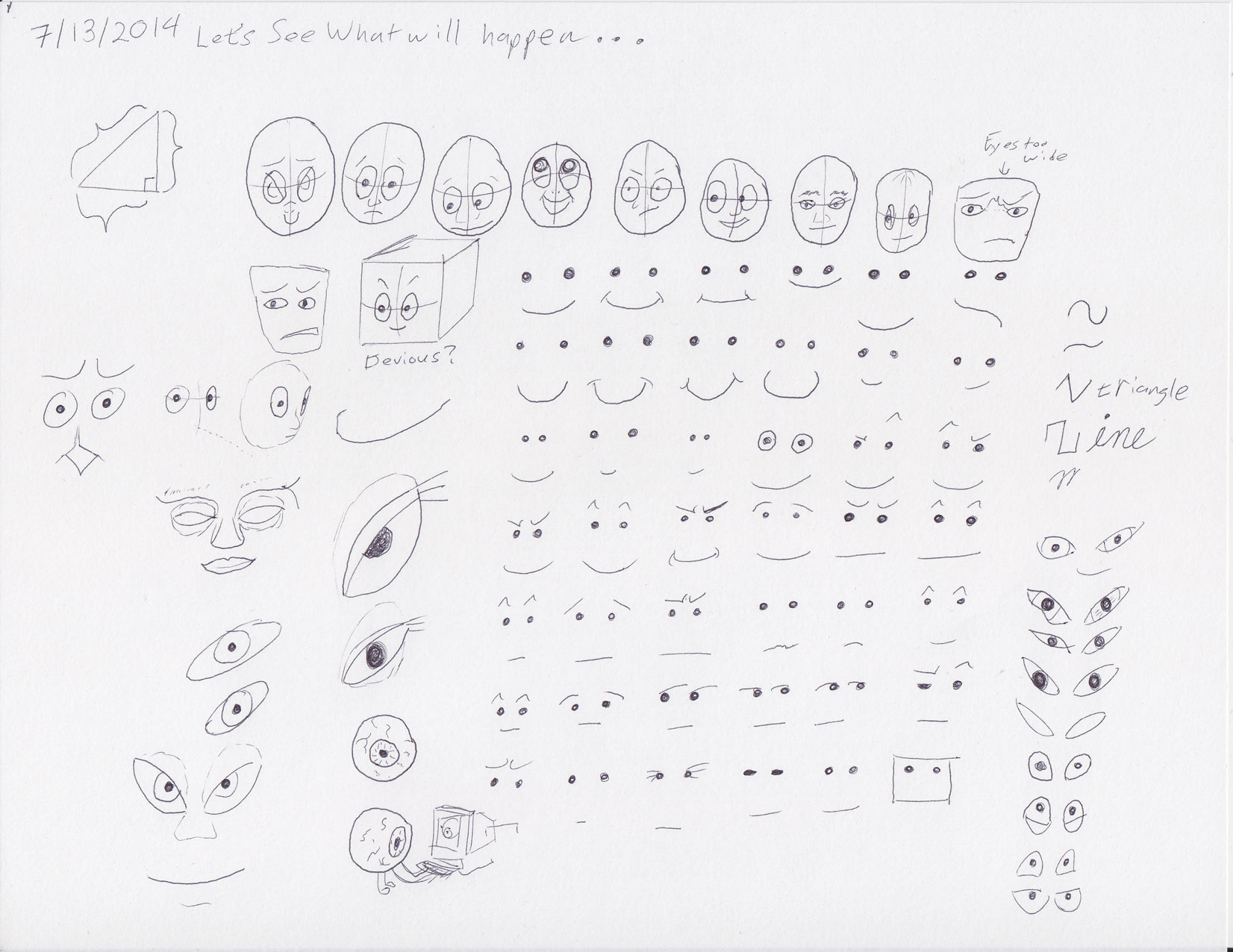 Facial expressions and eyes have been my recent fancy, specifically with how to convey an emotion. I started with the simplest faces I could, lines and dots, and tried to contort them into various expressions. I found that it is pretty easy to get an angry or sad fad, but much harder to get anything in between (kind of like that water temperature your shower can never get to). For the second picture, I added eyelids, eye lashes, the outlines of the eye in the socket, and eye brows. The brow on the left is a little cocked, with the attempted expression to be a "Really?". I have to admit I still don't understand how eye lids and eye brows interact with each other, but I do know that the gamut of expressions hides in that section of the face. Below are my sketches.