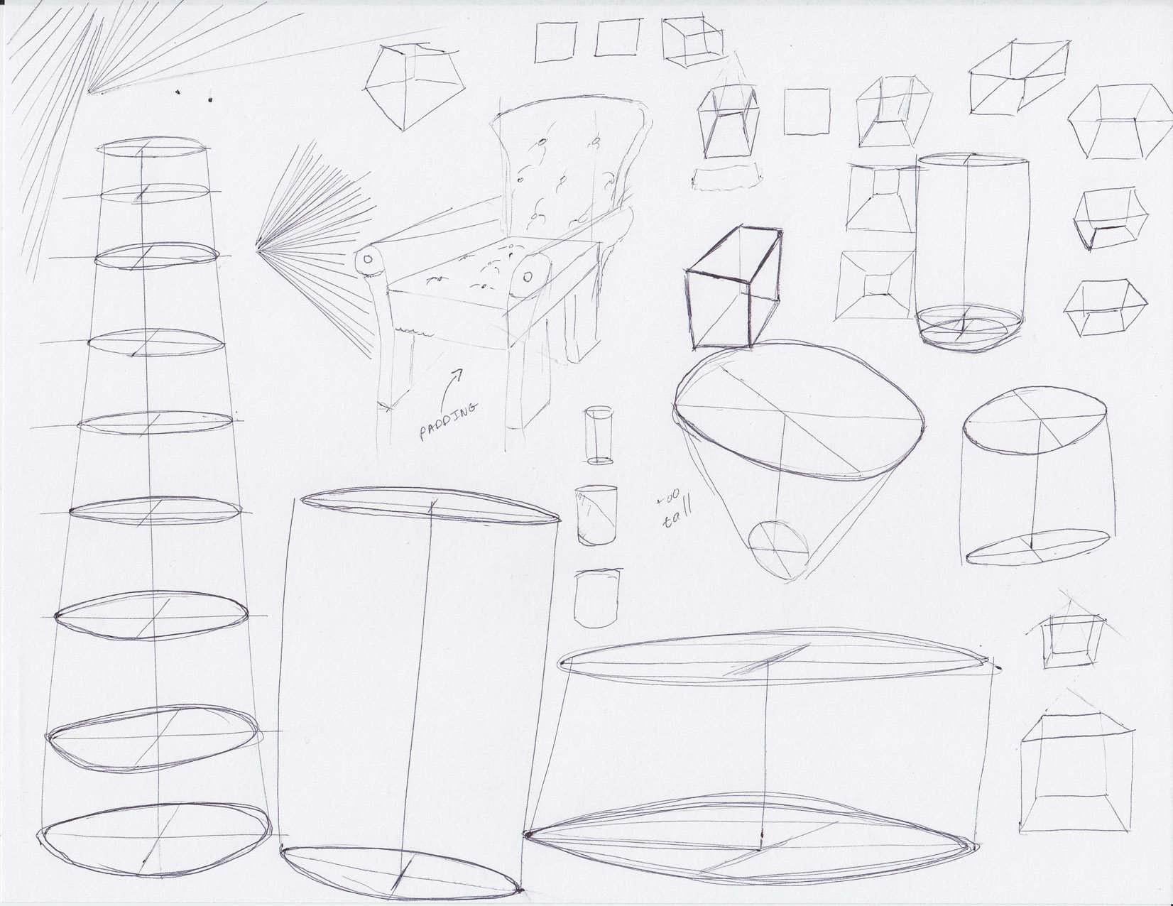Here is my conditioning drawing (cubes, cylinders, and an attempt at a padded chair) as well as my attempts at eyes and mouths: