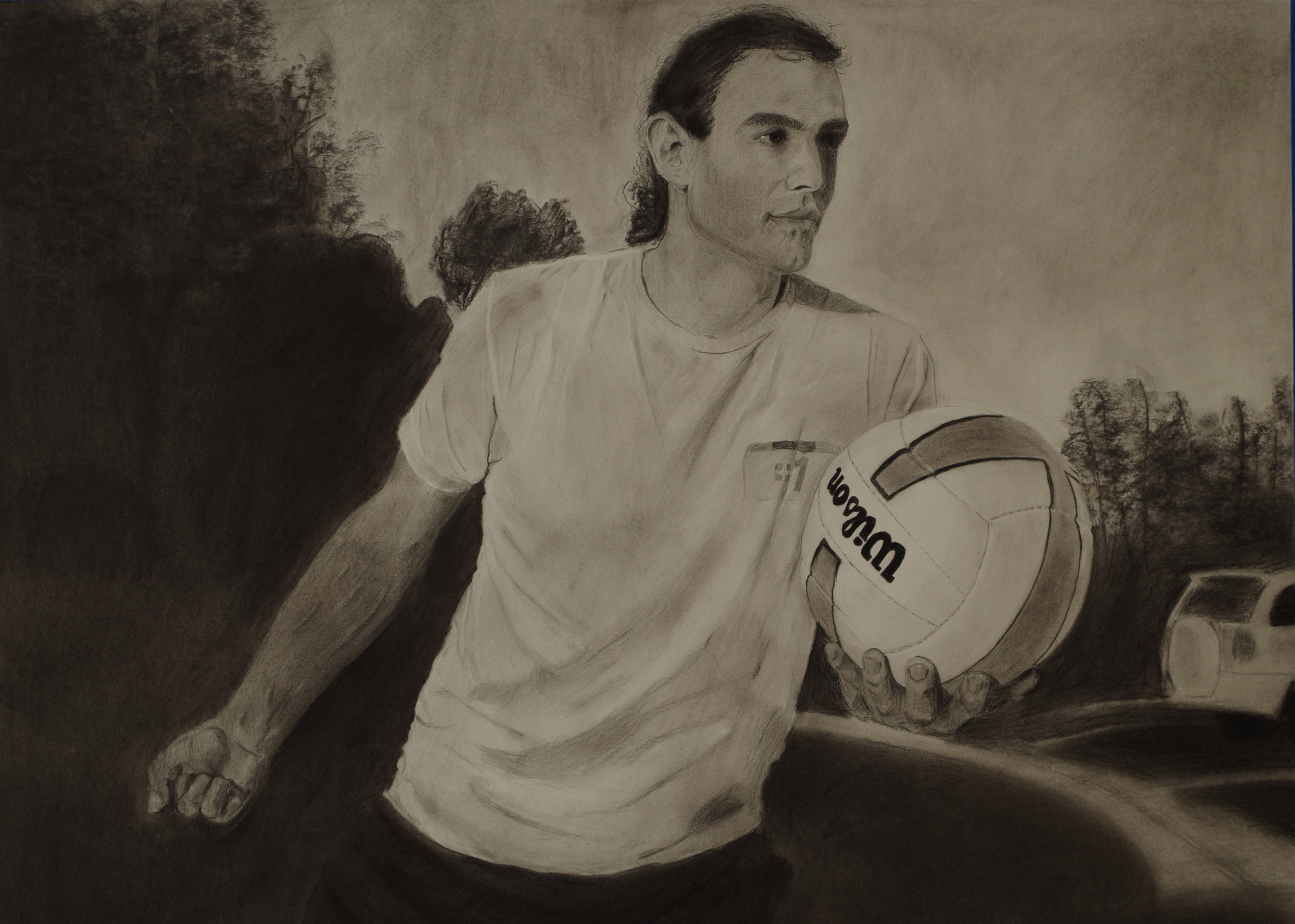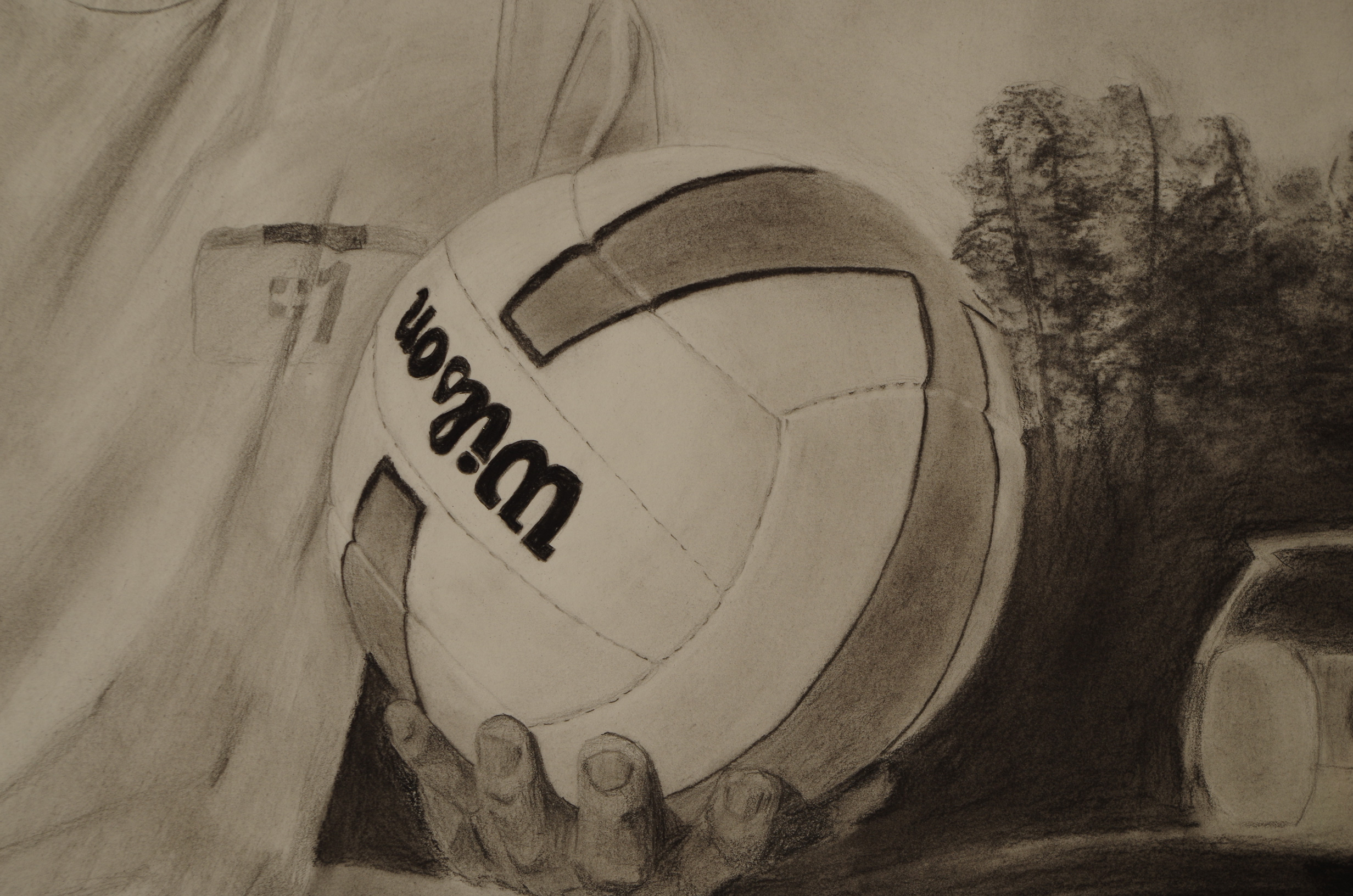 The volleyball turned out good too (I got the most compliments on the volleyball during the class critique). Some of the “Wilson” logos were left off the ball as to not distract from the rest of the piece. Two other things really make the volleyball “pop” out: First, the area around the logo is slightly brighter than the surrounding white material. This was done by using a paper towel and smearing some charcoal dust in ellipses on the far side of the ball. Secondly, the seams of the ball are slightly dark on one side, and brightened on the other. This really makes it seem like the seams have depth. I used a kneaded eraser over the edges for the effect.